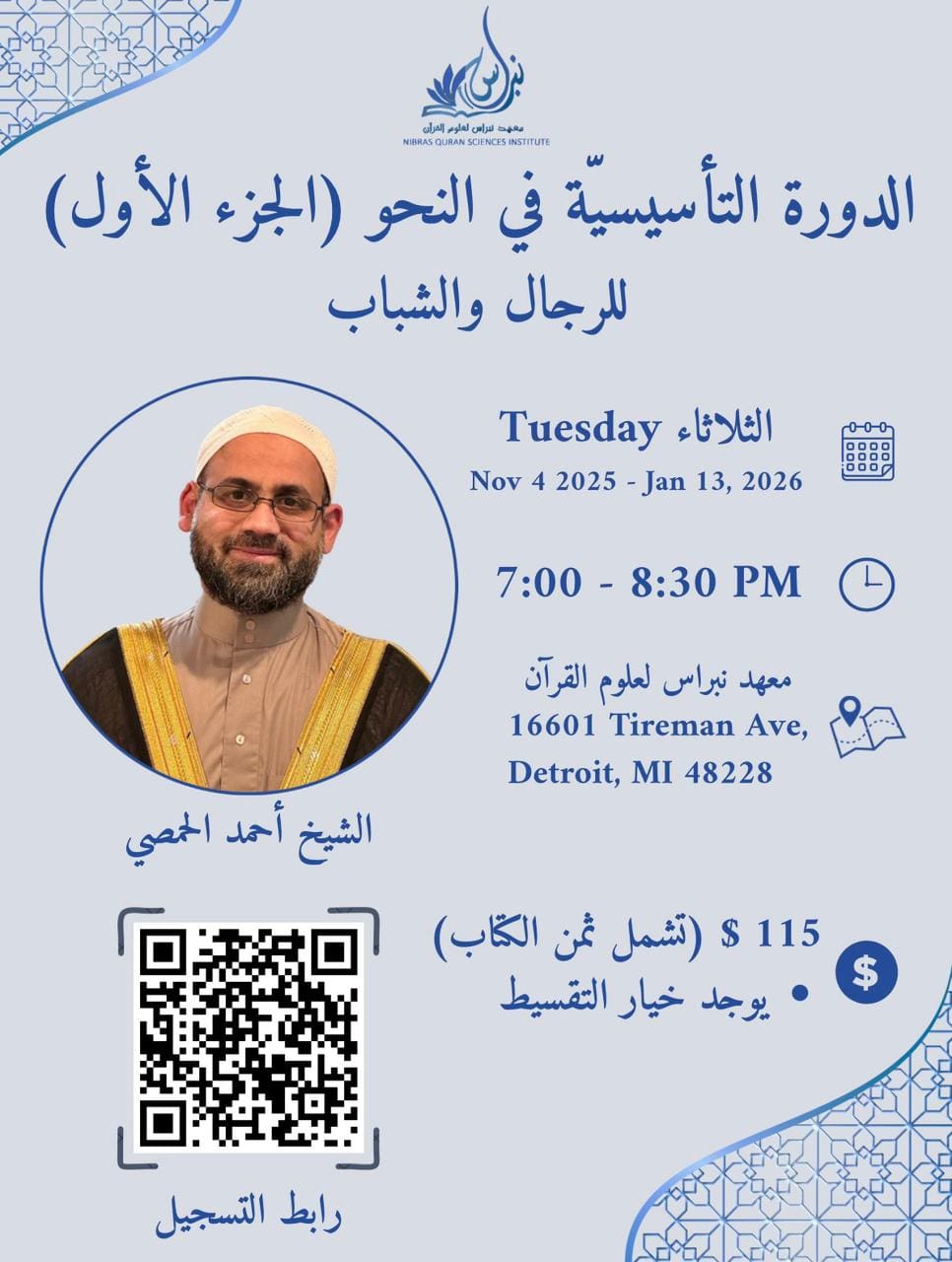 تعقد الدروس كل يوم ثلاثاء من 4 نوفمبر 2025 إلى 13 يناير 2026، من الساعة 7:00 إلى 8:30 مساءً، في معهد نبراس لعلوم القرآن – 16601 Tireman Ave, Detroit, MI 48228.